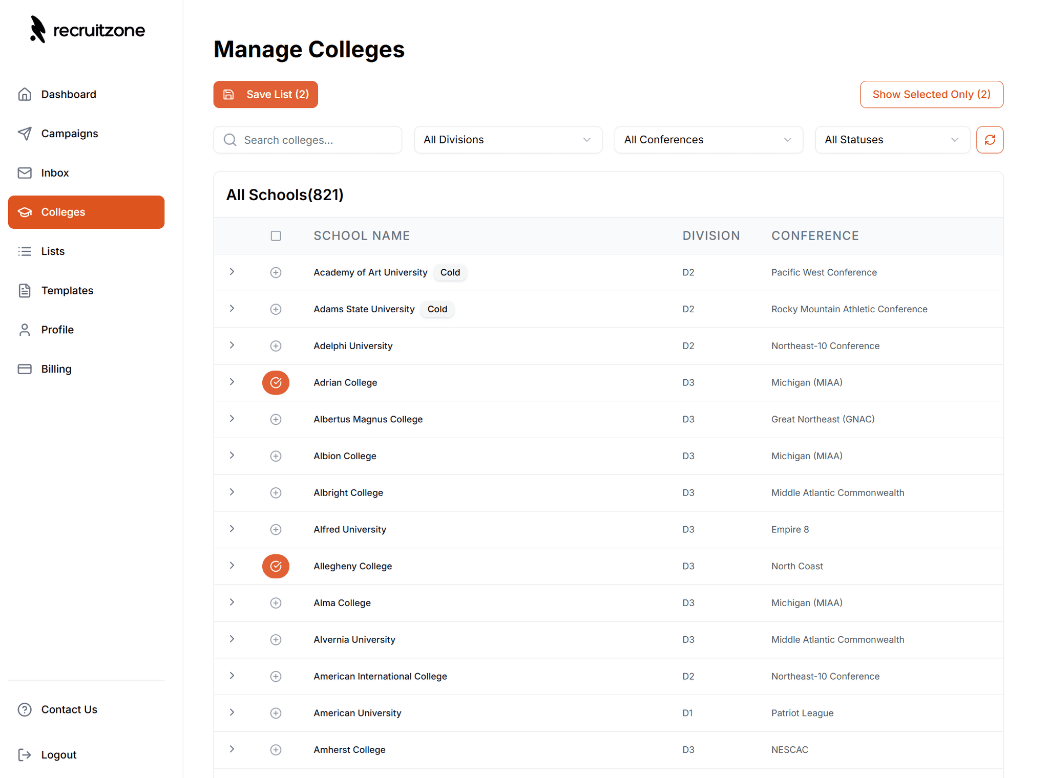 Create a targeted list of colleges to send personalized outreach emails that align with your goals and offerings.