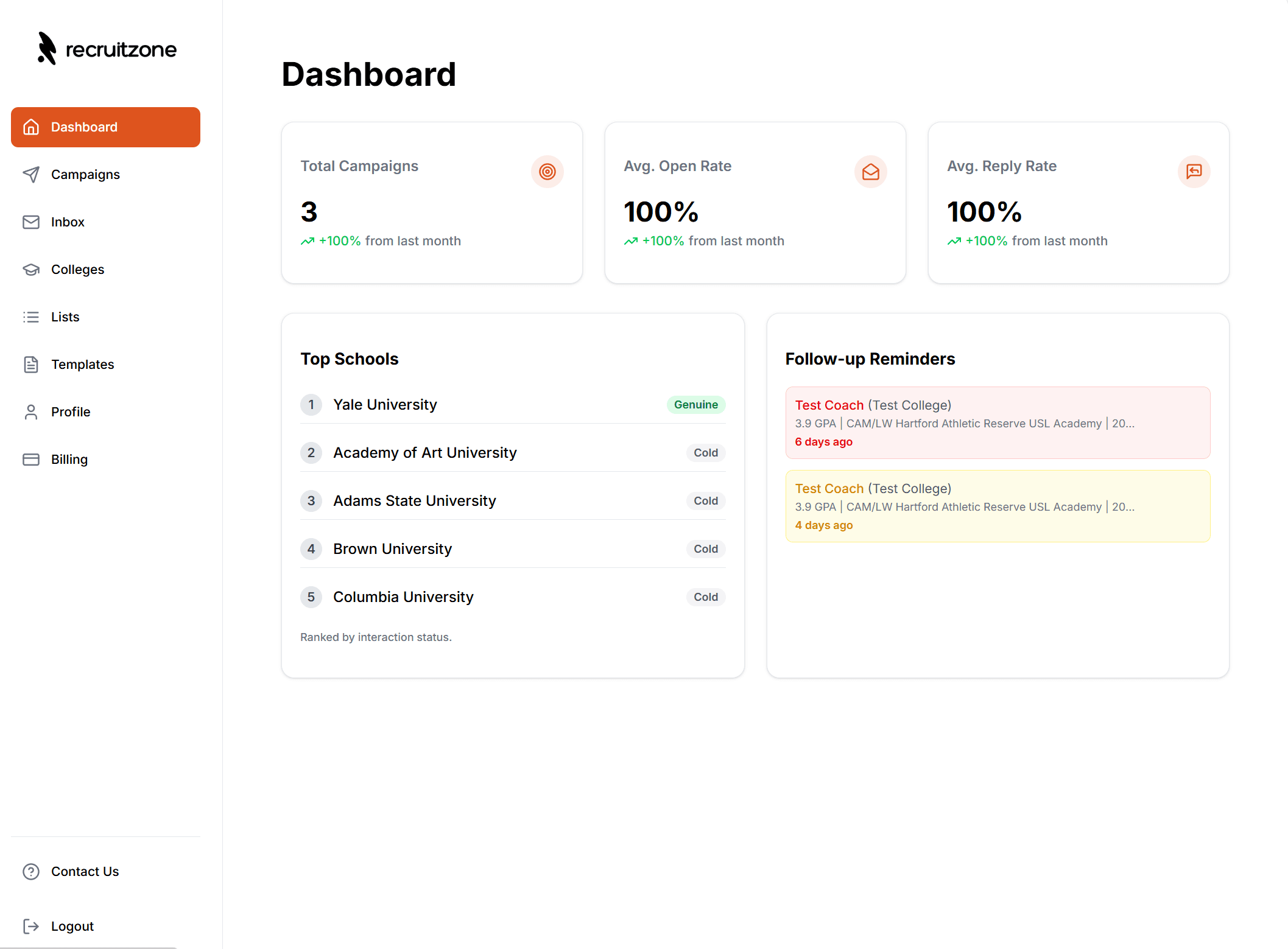 Connect with college coaches efficiently. Track your communications. Land more opportunities. RecruitZone helps athletes take control of their recruiting journey.